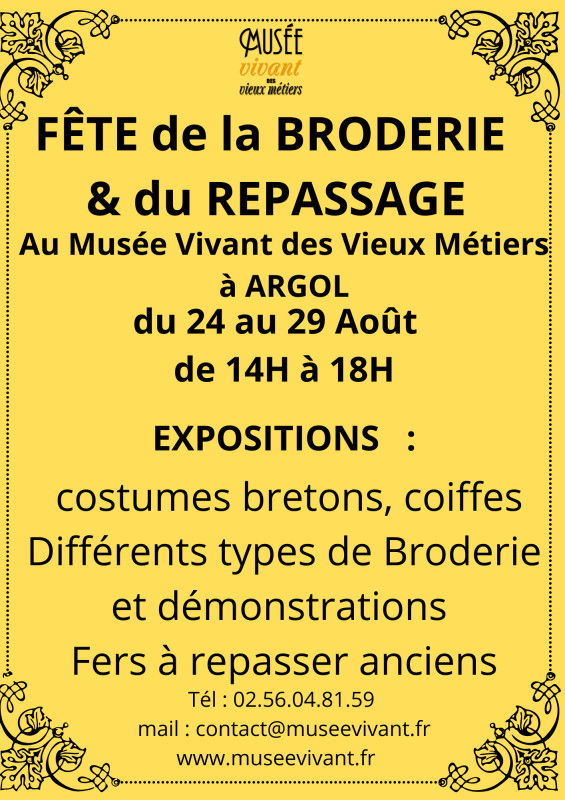 La Fête de la Broderie et du Repassage se tient du dimanche 24 au vendredi 29 août avec expositions de costumes bretons, coiffes, différents types de Broderie, fers à repasser et objets du quotidien anciens. Démonstrations des brodeuses et brodeurs.